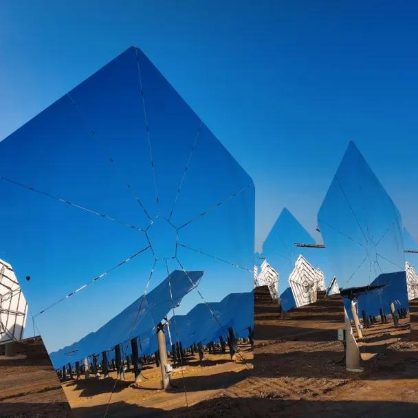 茫茫戈壁,百米高塔巍然耸立,万余面定日镜“逐日”而动,犹如一朵巨大的“银色向日葵”。这朵“向日葵”由行业首创的14500面正五边形定日镜构成,正在服务于国家首批太阳能热发电示范项目、新疆首个光热发电站——新疆哈密50兆瓦熔盐塔式光热发电项目。该项目每年贡献近2亿度清洁电能,为新疆绿色低碳发展带来更多可能。